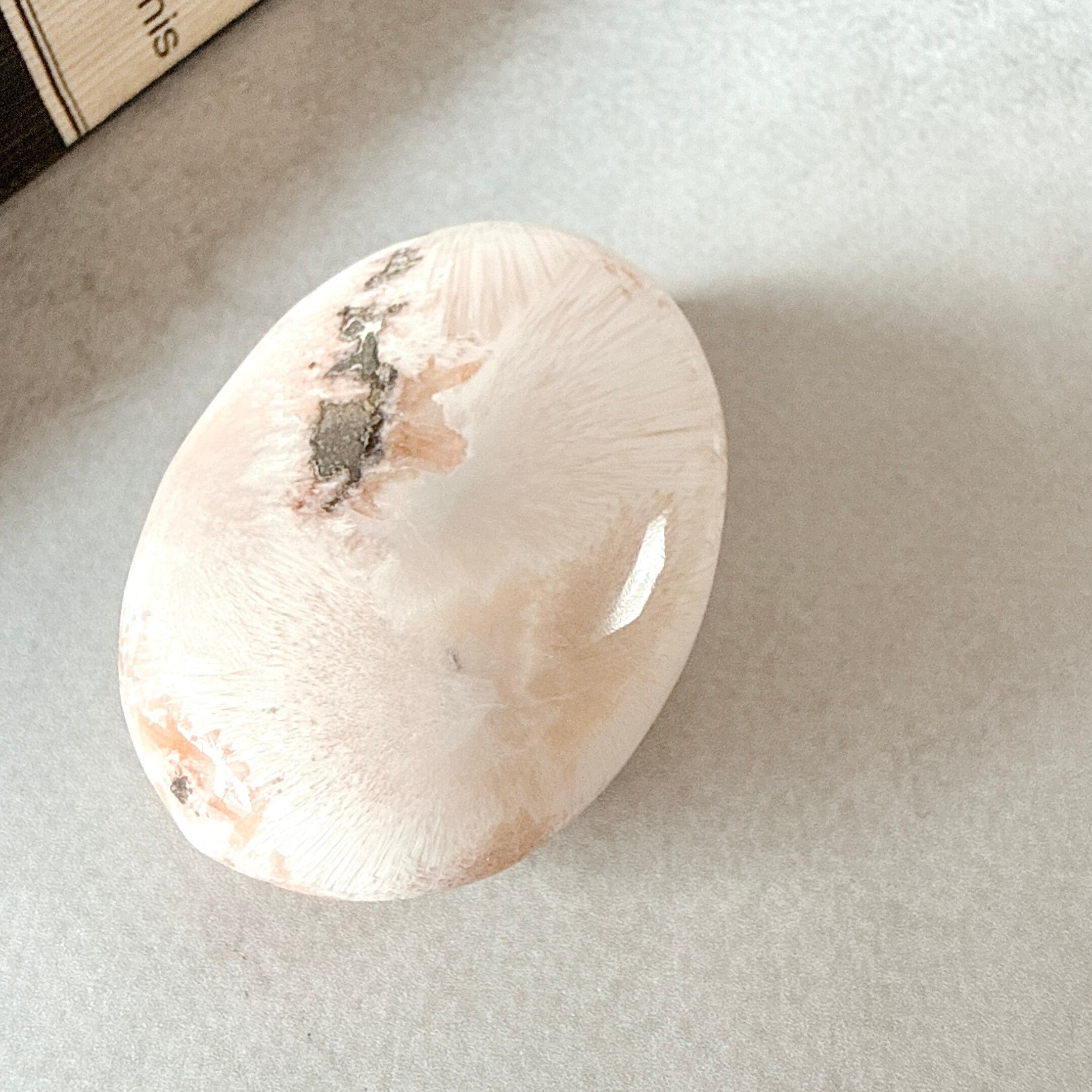 ミルキーなホワイトと淡いピーチカラーが水彩画のように広がり、スコレサイト特有の放射状の輝きがくっきりと浮かび上がります。